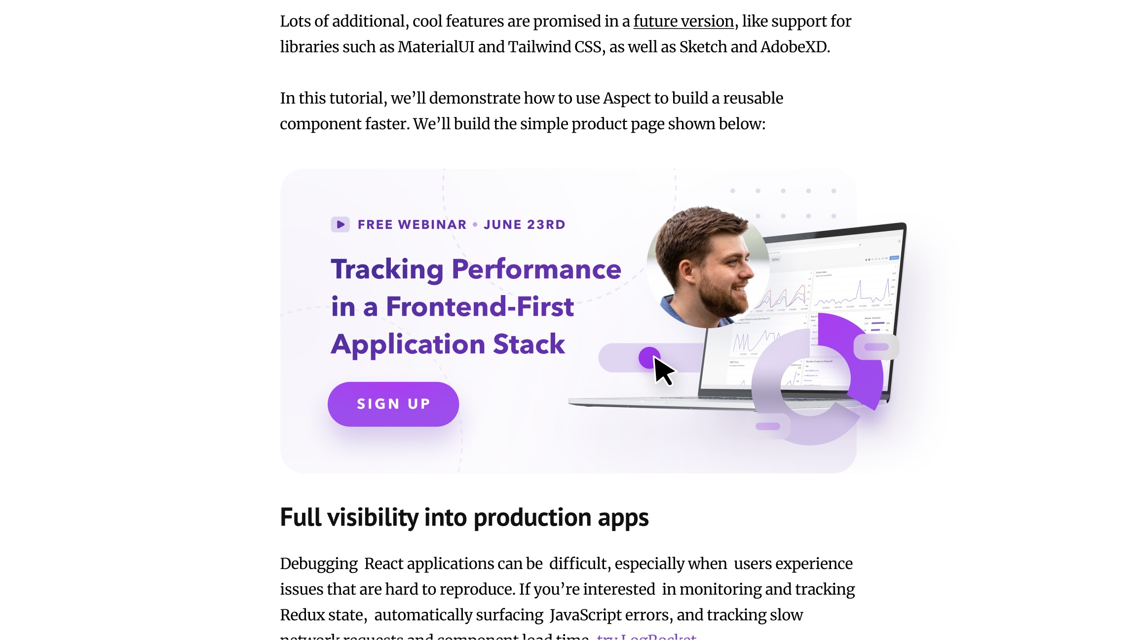 Interstitial ad on LogRocket's blog – social proof concept